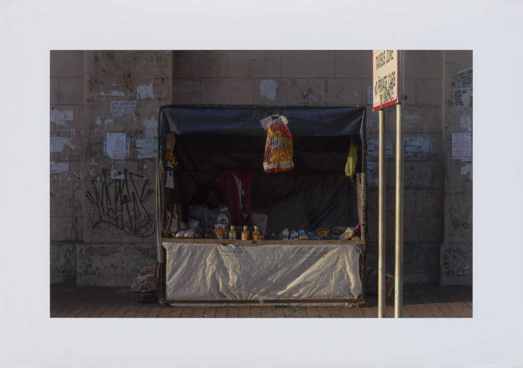 The plastic shelter, the everyday items on display, and soft light that brushes the edge of the frame all speak to a fragile resilience. This image is not just about a physical stall — it is about the present, and about holding ground in a city that often looks away. Through the stillness, texture, and light, the photography honours the perseverance of people whose labour sustains communities in the background of urban life.