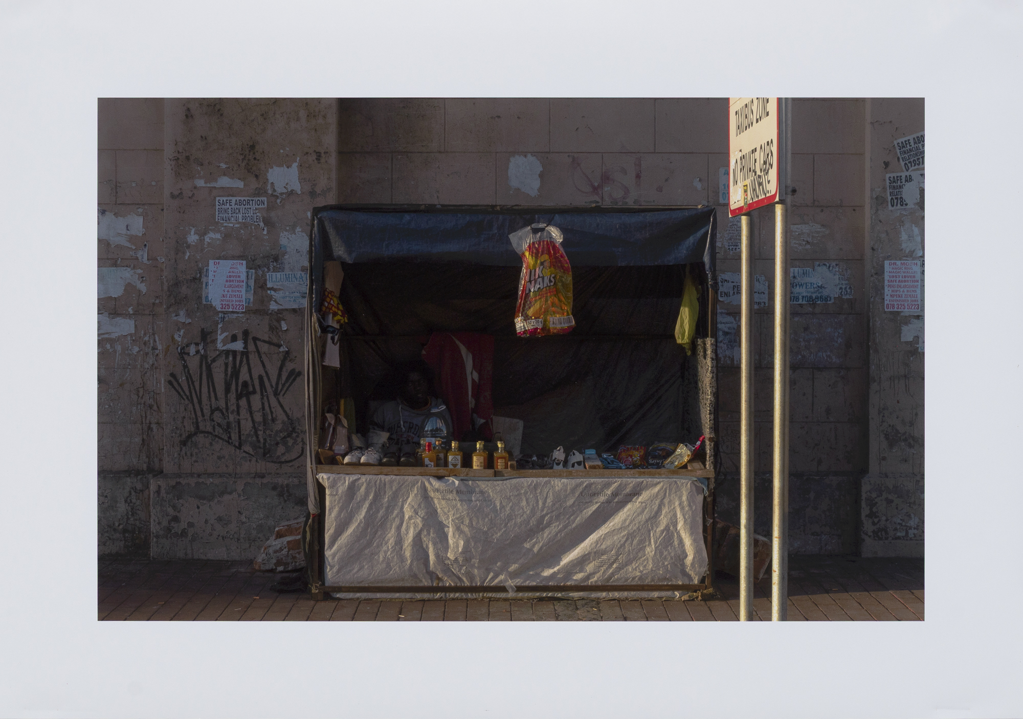Captured in Gqeberha, this photograph reflects the quiet strength of informal street traders who carved out space for survival within the city’s neglected margins. Set against a weathered wall layered with graffiti, torn posters and worn textures, the vendor is partly swallowed by a shadow, symbolising the social and economic invisibility faced by many who work in the informal economy.