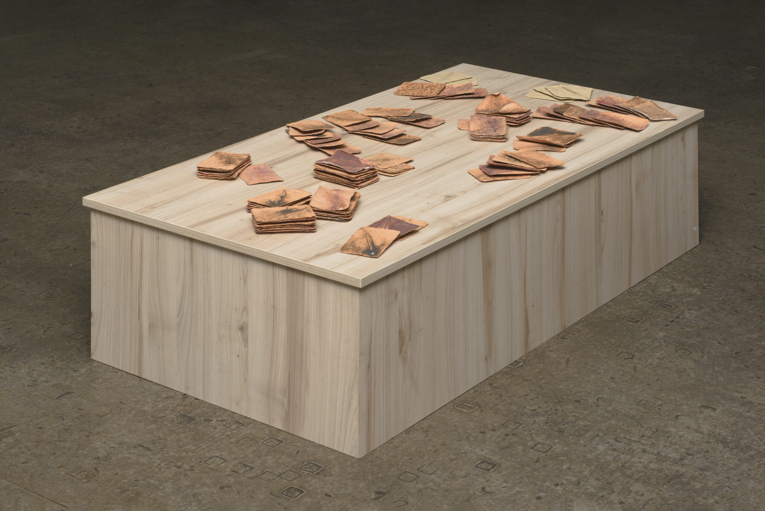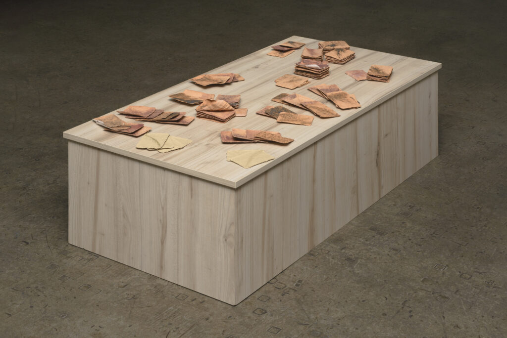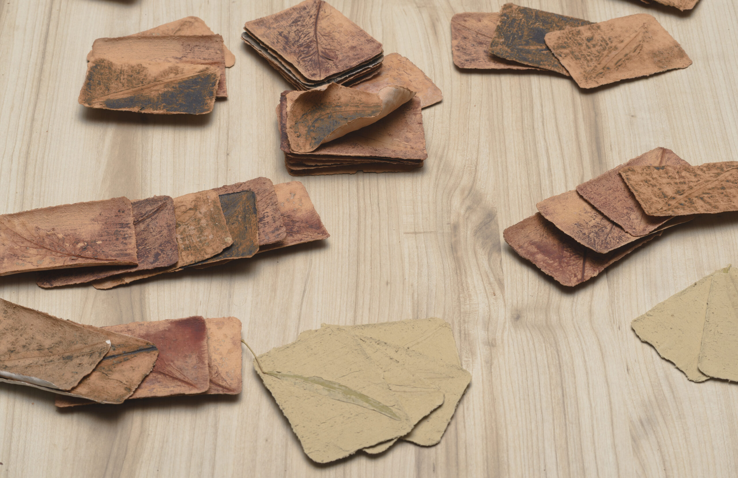 I enjoy seeing what clay can do. I am fascinated by how thin clay can go. In this artwork, it is just a game. I have made two “decks” of “playing cards”. One with black, copper oxide, with a thin leaf imprint into the cards, and red, iron oxide, with a wider leaf imprint into them. These are my “decks”. I have also left a few cards unfired to show the contrast between the raw clay and the fired clay.