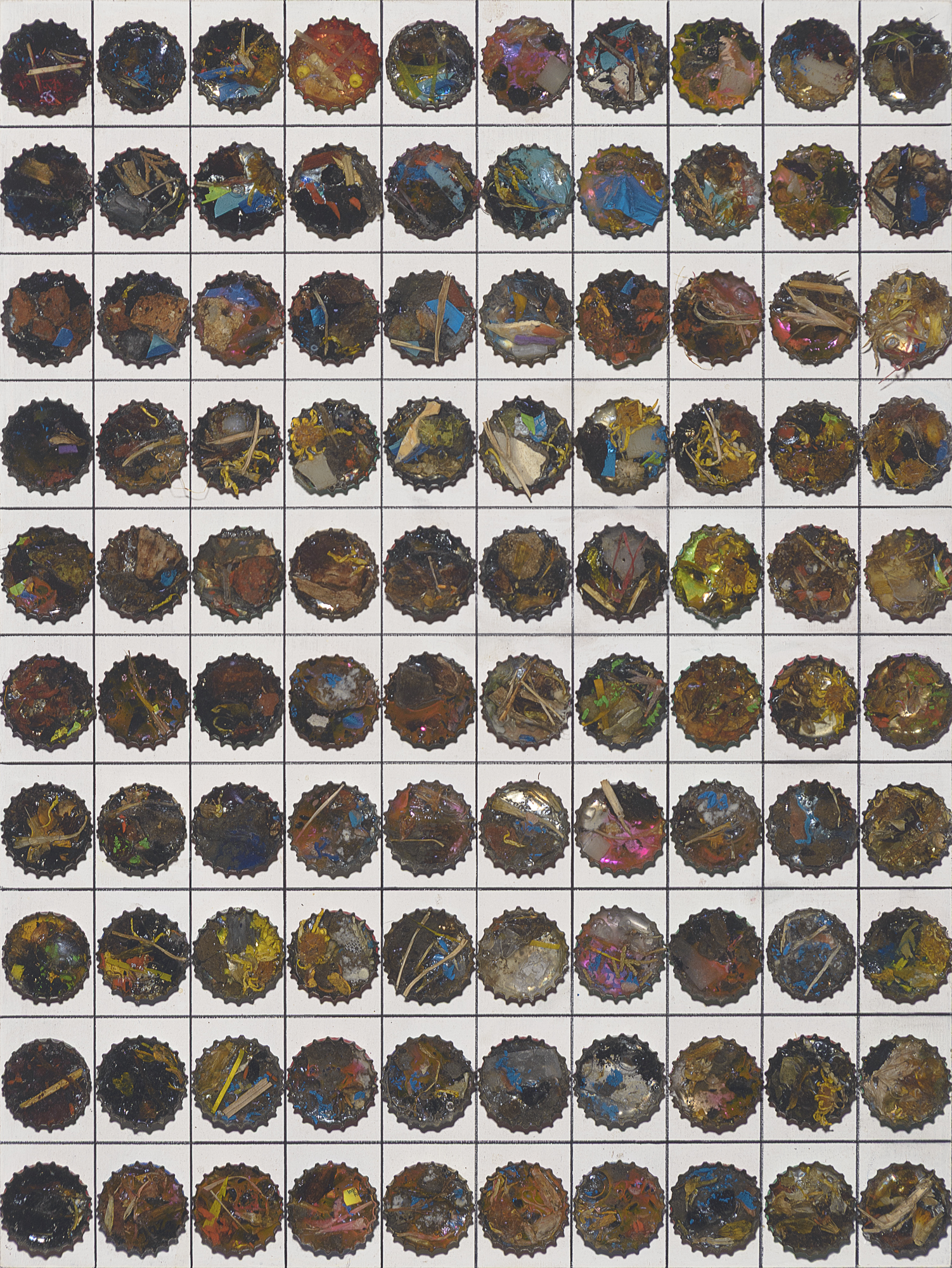 Stories from a Broken Landscape consists of 100 small artworks that fragment the landscape into miniature, recycled worlds, while also creating dialogues among the individual pieces. The 100 bottle caps contain and attempt to preserve traces of the landscape. As part of the modern South African environment, we also encounter remnants of plastic and pollution. Within the bottle caps, the artist interweaves natural and synthetic elements to comment on a landscape that is increasingly neglected—breaking Mother Nature’s heart through pollution.