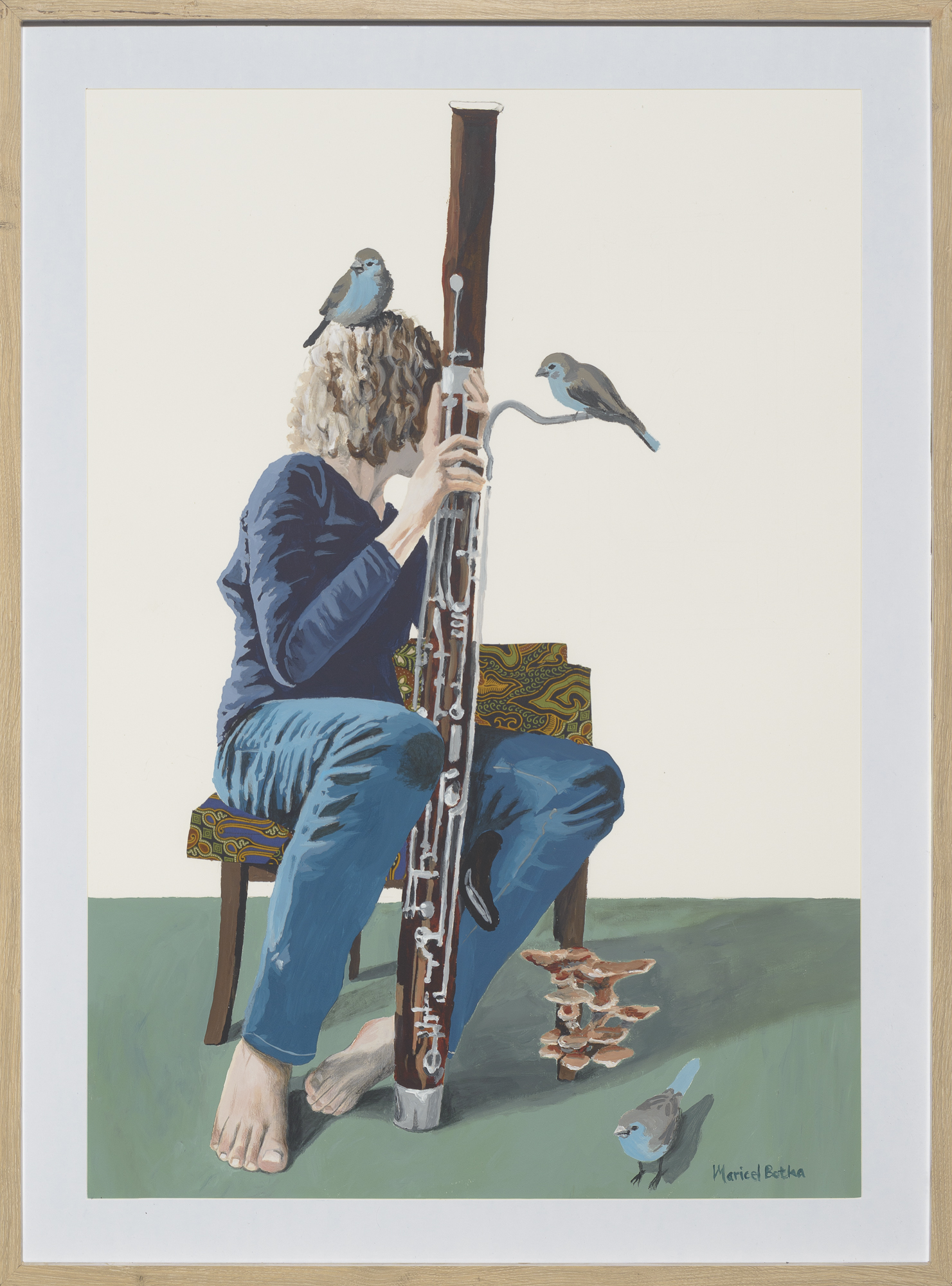 This work reflects an autobiographical engagement with dreams and diversion amid the domestic quotidian. It thematises the tension between interior and exterior spaces, both physical and psychological. The domestic setting represents comfort, but also confinement. Nature’s welcome “intrusion” into the home by means of mushrooms and over-sized blue waxbills, unsettles the ordinary and bridges the divide between reality and unreality. The work suggests fluidity between mental and physical states and acknowledges the power of thoughts and dreams in constructing or narrating personal experience. What is imagined is not subordinate to what is tangible in as much as it shapes a very real inner experience. The bassoon becomes a symbol of escape through enjoyment and, as a symbol of creativity and culture, offsets stereotypical images of feminine domesticity.