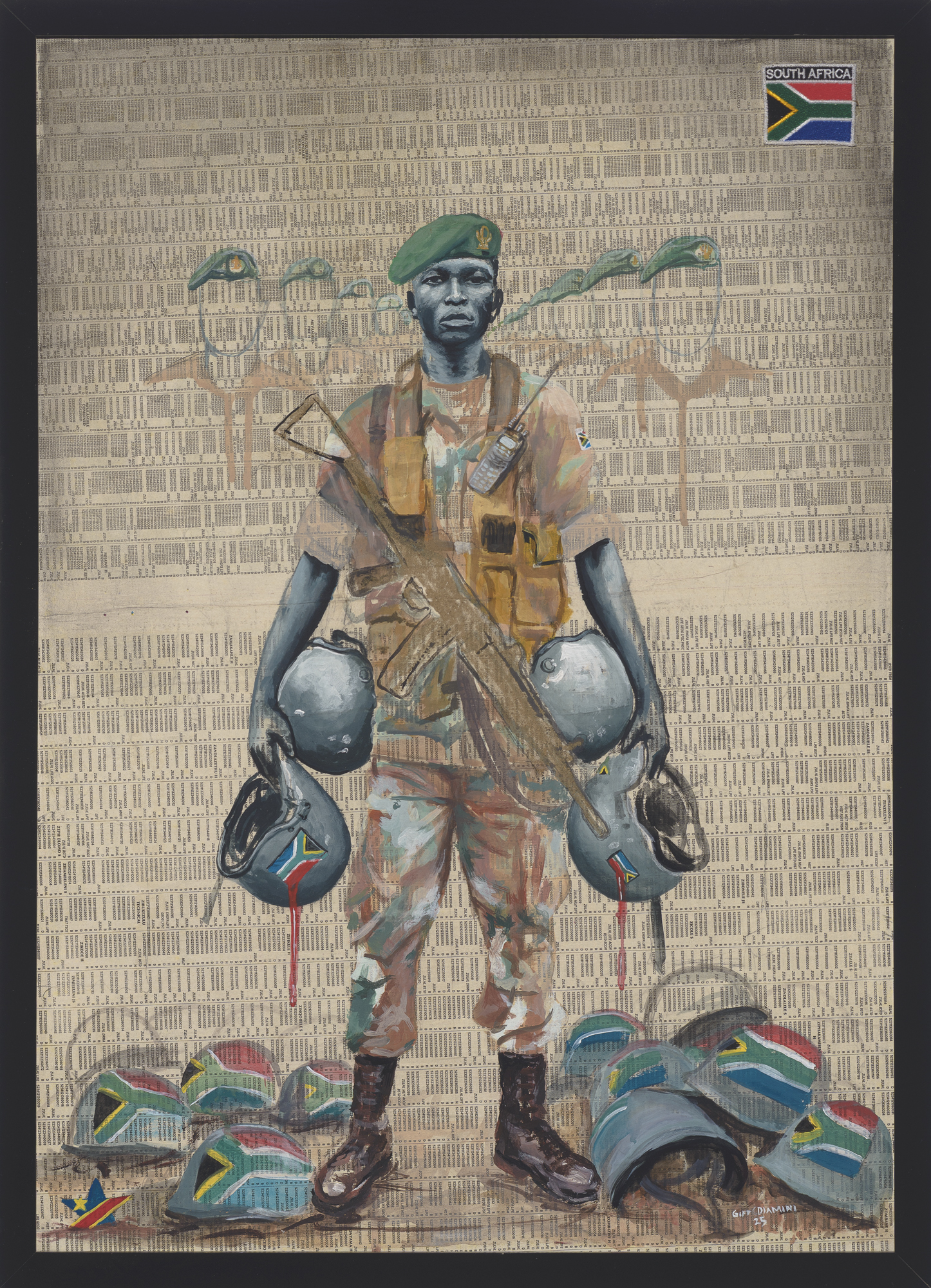 The central figure represents the South African soldier, strong yet visibly burdened. The helmets, stained with blood and marked by the national flag, symbolise lives lost in service. Ghost-like silhouettes behind him echo the presence of the fallen, while the coded background alludes to how soldiers are often reduced to data or headlines, stripped of identity.