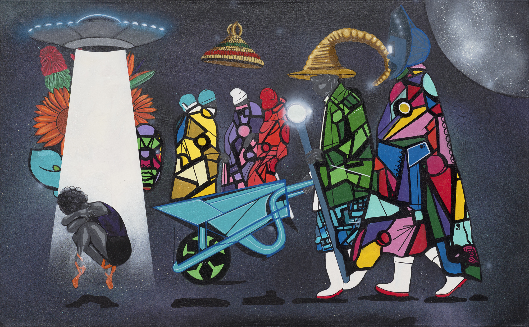 The Basotho hats and wheelbarrow represent my pursuit of pride and knowledge, celebrating cultural identity and resilience. The wheelbarrow signifies the hard work and dedication that have gone into preserving traditions and passing them down to future generations. Using spray cans, I capture the essence of the galaxy and moon, evoking dynamic energy and contemplation.