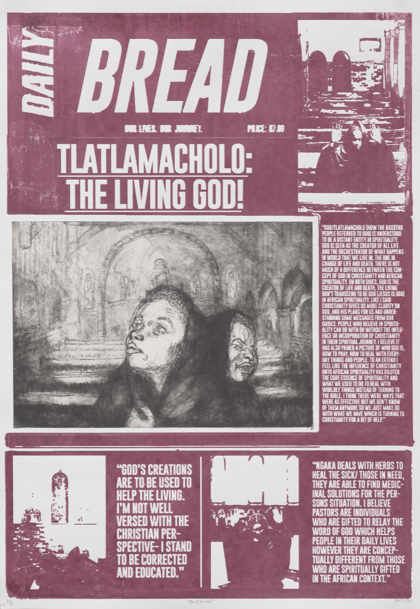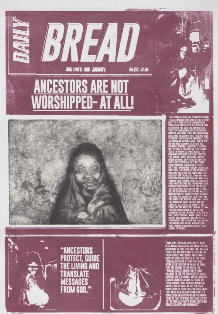 I express this tension using a newspaper metaphor, depicting spirituality as a battleground covered in competing headlines and op-eds declaring one path superior. The woman’s story grounds the narrative; her personal rituals (like burning sage or Basotho-inspired stargazing) contrast with symbols of the church. The newspaper’s fragmented design visually echoes her fractured identity, caught between the kraal (ancestral homestead) and the cross.