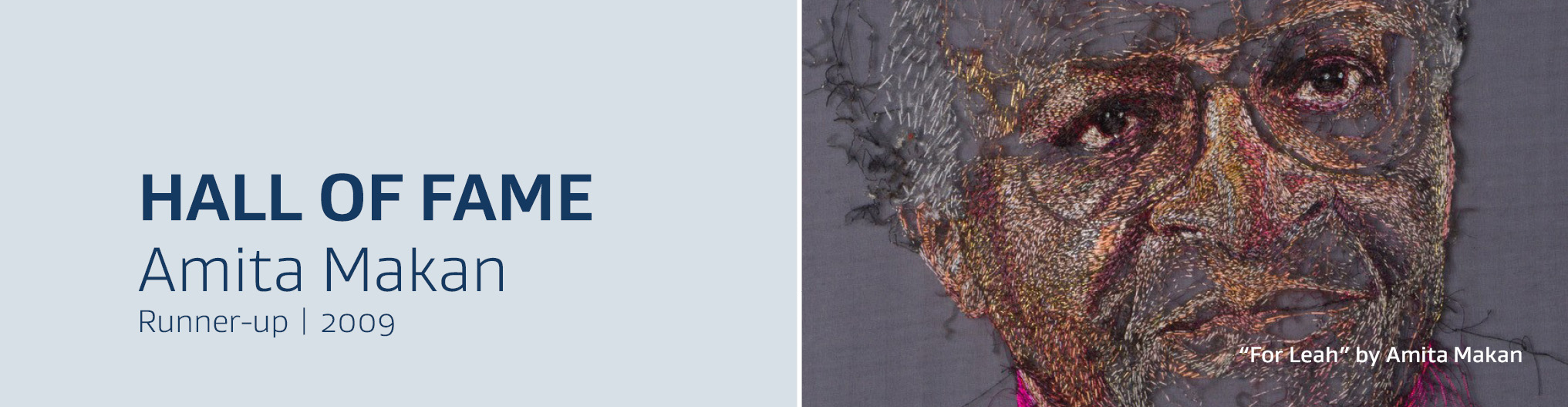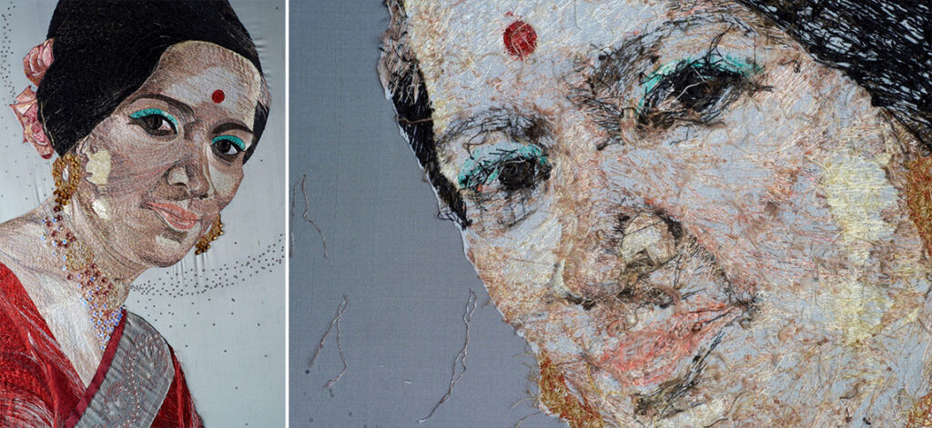 Makan often uses saris worn by her mother in her embroideries, carefully unravelling the threads into single strands with which to create ‘new’ images, or cutting the fabric into smaller pieces, both acts becoming part of the metaphor. The threads infer mortality, a continuity of life, the transfer of DNA from one generation to another, but also the traumatic manner in which life can be terminated as with the cutting of a thread. The resulting portrait successfully weaves aspects of portraiture and embroidery as medium into a sensitive comment about grief and loss.
