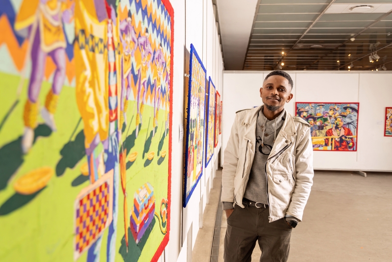 Ingoma Yothando, or Song of Love translated from isiZulu, is the solo exhibition by Mondli Mbhele, winner of Sasol New Signatures 2022 and was also unveiled at the Pretoria Art Museum on 6 September. Mbhele’s medium of choice is fabric collage, as for him it shares similarities with our daily lives. Fabric covers our bodies, while boosting our confidence and providing a new canvas for each day. Mbhele collects offcuts of fabric from various fusion artists in Durban and Johannesburg for use in his collages. He realised that these offcuts have different qualities and value or worth, but when discarded they become a metaphor for a state of vulnerability. By collecting and using these offcuts, he creates a new dialogue between that which is discarded and its worth.