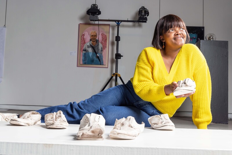 Matikinca won the coveted title for her work titled Ndiziphiwe –They were given to me, a ceramic installation about underprivileged learners who wear school shoes that are handed down to them by their older siblings or family members. By immortalising these shoes through the ceramic slip-casting method, they have been given a new purpose. This process also enables the artist to capture the essence of the used shoes, including every mark, scratch and hole. As ceramic sculptures, the shoes have been symbolically restored, but are also very fragile and breakable. This fragility is a metaphor for the precarity of the public schooling system of our country, where black South African learners are subjected to sub-standard education.
